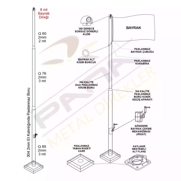 8 metre profesyonel bayrak direği ürünümüzde 360°Sonsuz Döner Tepe, Bayrak Boncuğu, İp Sarma Mekanizması(Irgat,Patentli Ürün), Taban Rozeti(Kare), Menteşeli Flanş ve Ankaraj Malzemeleri bulunmaktadır. Bayrak ürüne dahil değildir.