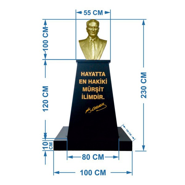 Atatürk Büstü kaidesi olarak imal ettiğimiz bu modelin çift taraflı paslanmaz galvaniz sac üzerine elektrostatik fırın boya yapılmıştır . Alt kısmında yere montajıda yapılabilen hazır kaide modelinin, üzerindeki yazı folyo renginde pleksiglas harf den istenilen metin yazılacaktır. Üst kısımdaki Atatürk Büstü 100 cm yüksekliğinde profesyonel modeldir.