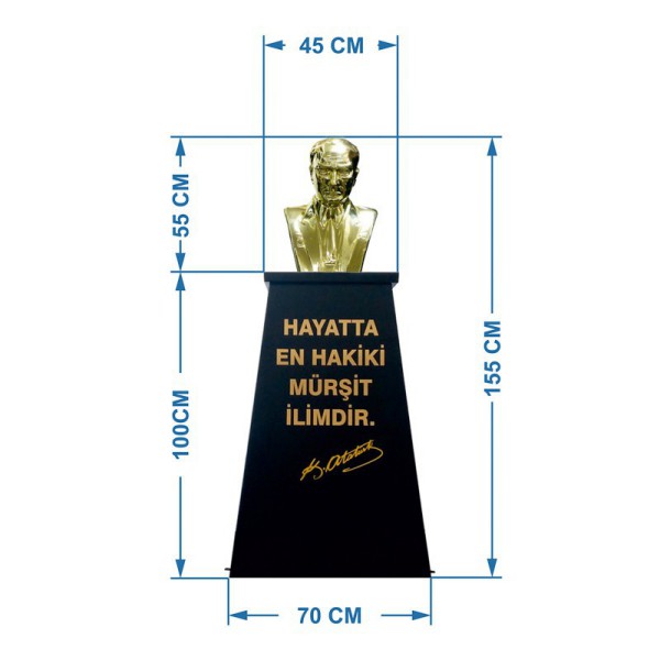Atatürk Büstü kaidesi olarak imal ettiğimiz bu modelin çift taraflı paslanmaz galvaniz sac üzerine elektrostatik fırın boya yapılmıştır . Alt kısmında yere montajıda yapılabilen hazır kaide modelinin, üzerindeki yazı gold renginde folyo harf den istenilen metin yazılacaktır. Üst kısımdaki Atatürk Büstü 55 cm yüksekliğinde profesyonel modeldir.