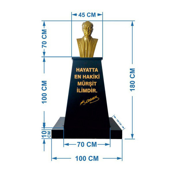 Atatürk Büstü kaidesi olarak imal ettiğimiz bu modelin çift taraflı paslanmaz galvaniz sac üzerine elektrostatik fırın boya yapılmıştır . Alt kısmında yere montajıda yapılabilen hazır kaide modelinin, üzerindeki yazı gold renginde folyo harf den istenilen metin yazılacaktır. Üst kısımdaki Atatürk Büstü 70 cm yüksekliğinde profesyonel modeldir.